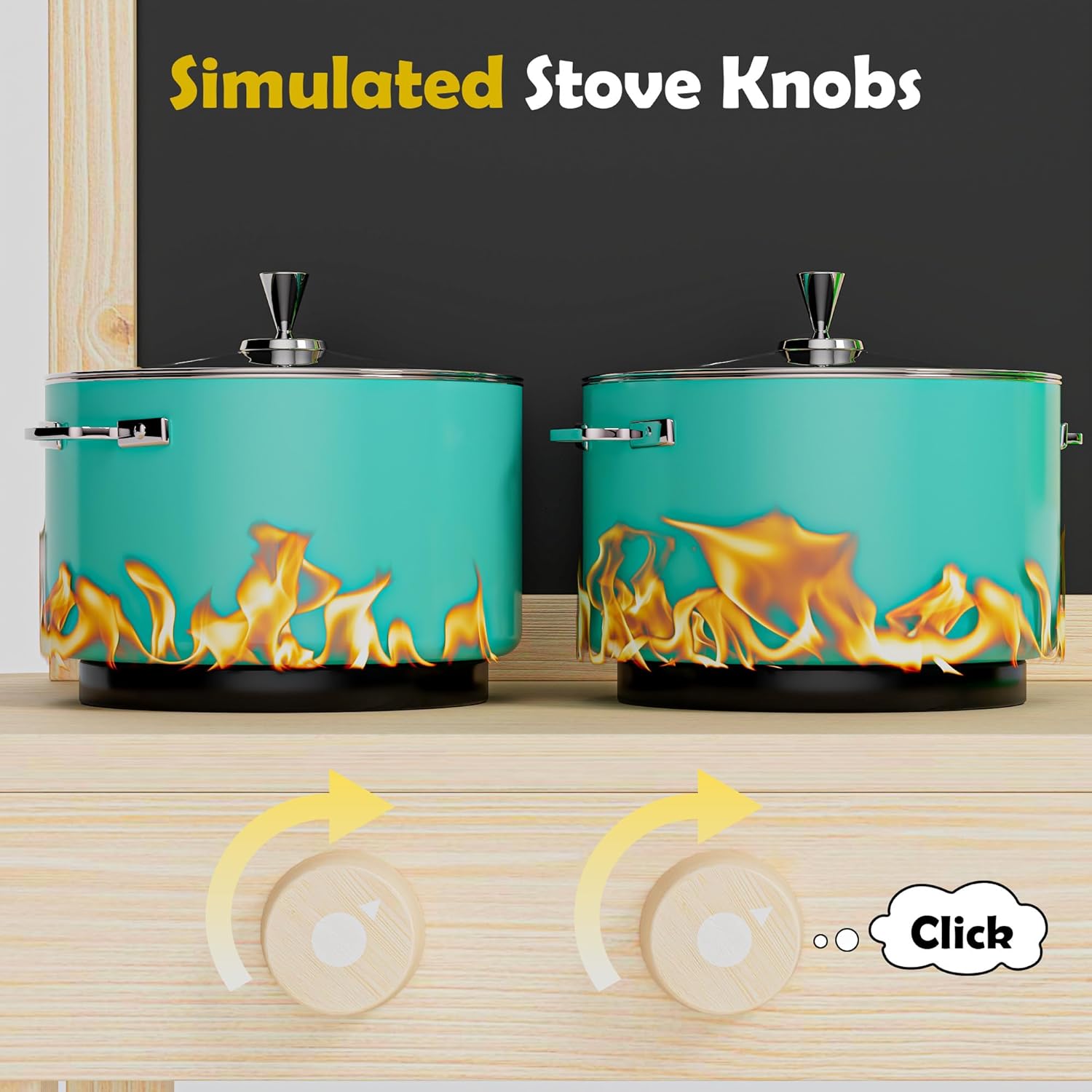 - Hob with rotating noises: two play hobs with clicking knobs ensure a realistic cooking feeling. The black induction look brings extra fun to any role play kitchen - pots and pans are not included.